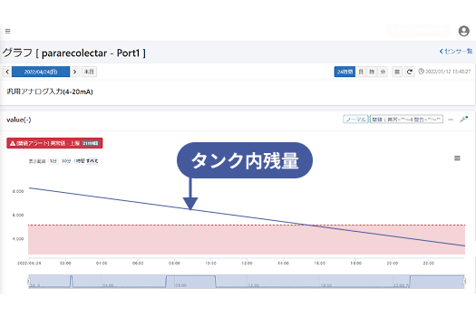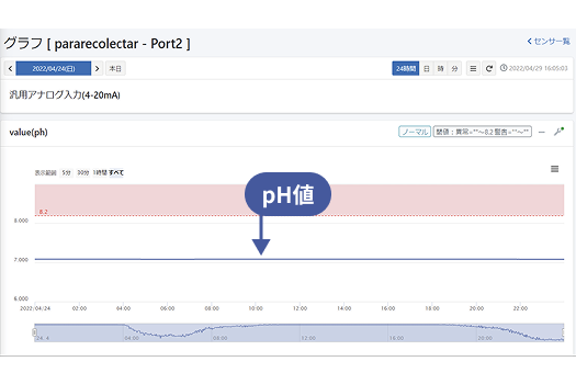アプリ画面で、リアルタイムにグラフ表示。閾値を超えるとアラートで通知されます。